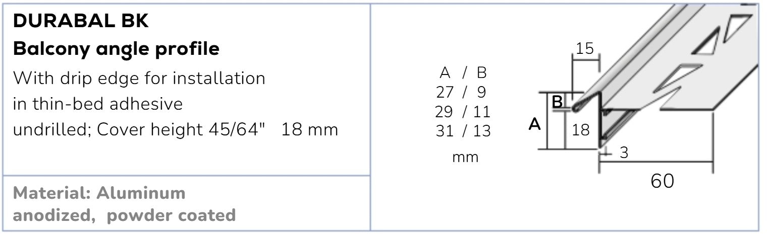 The DURABAL BK edge profile is made of anodized aluminum and has an inclined drip
